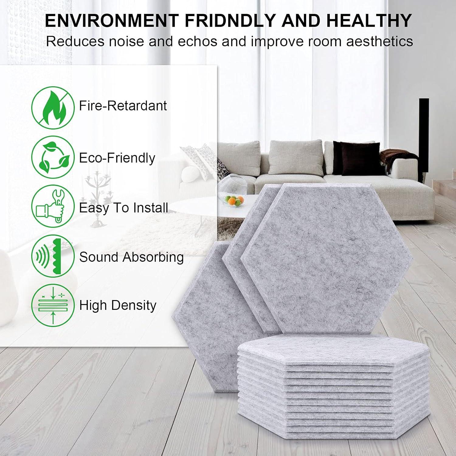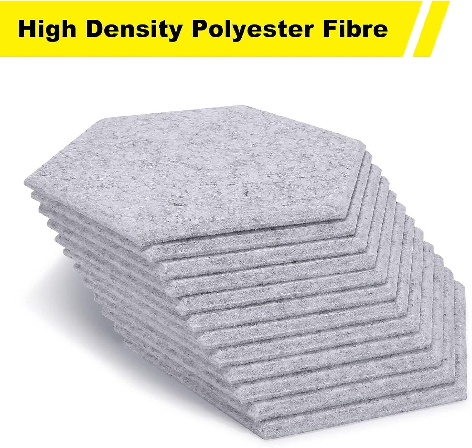 POWERFUL SOUND INSULATION: This kind of hexagon absorption panel is formed by 100% high density of polyester fiber, which is of sound insulation, flame retardance, insipidity, skid resistance, non-toxicity, corrosion resistance and fading resistance. It weighs 300lbs per cubic yard, thus, having a better sound insulation effect than those soundproofing foams.