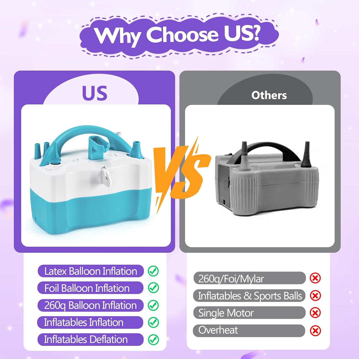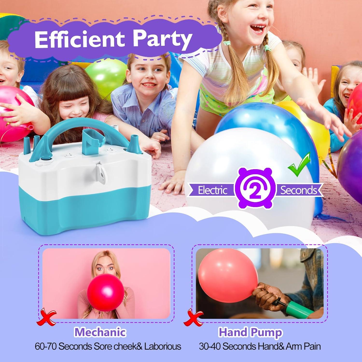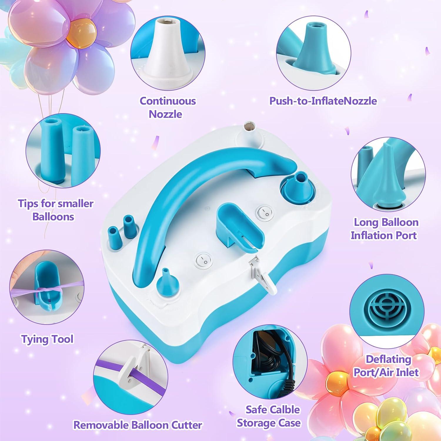 Suitable for all balloons: With two independent high-power motors and two inflation ports, this balloon pump can quickly inflate all types of balloons, including 260q long balloons, foil balloons, latex balloons, and letter balloons. It's perfect for balloon arch making, animal balloon DIY, and party decorations, allowing you to effortlessly create a vibrant and festive atmosphere for any party or special occasion.