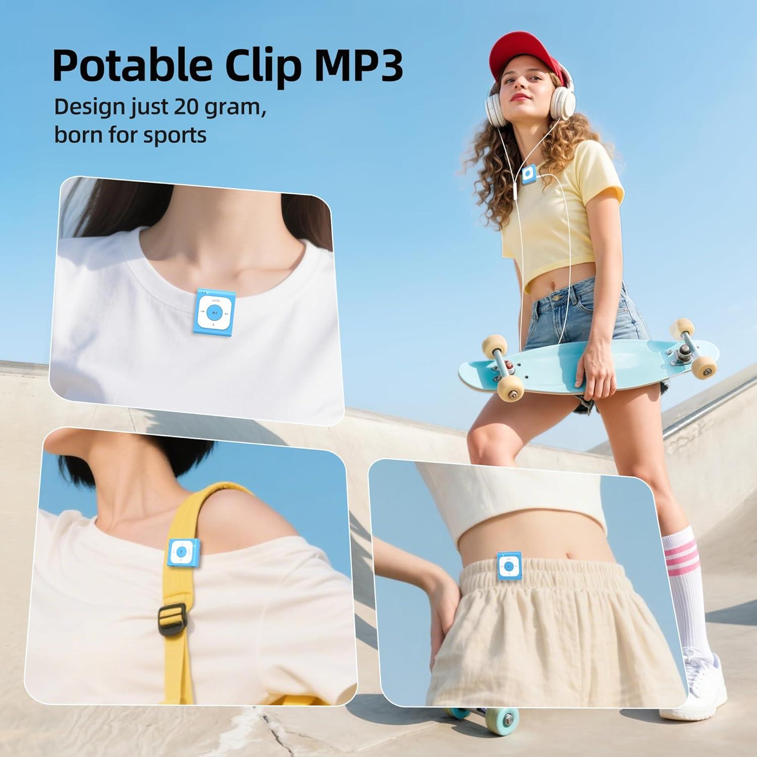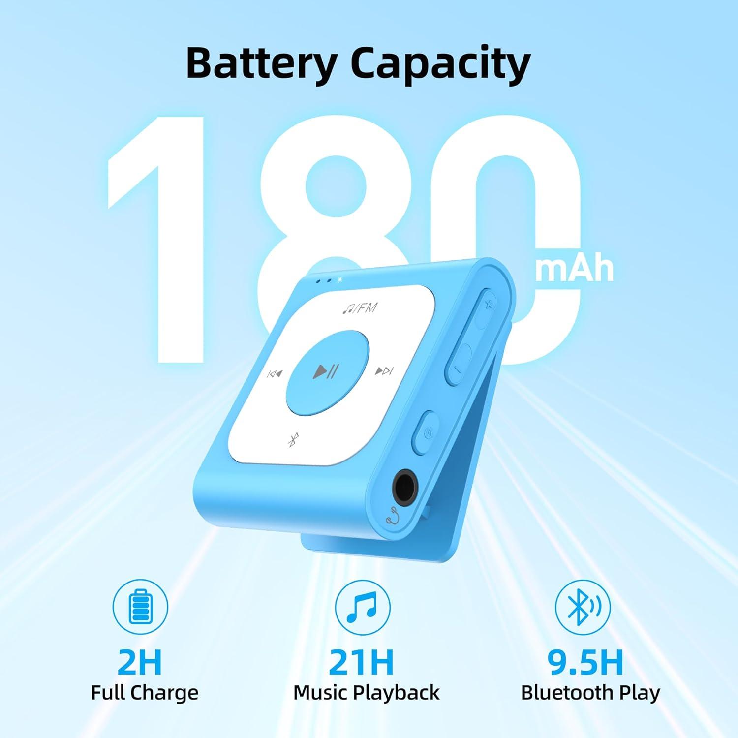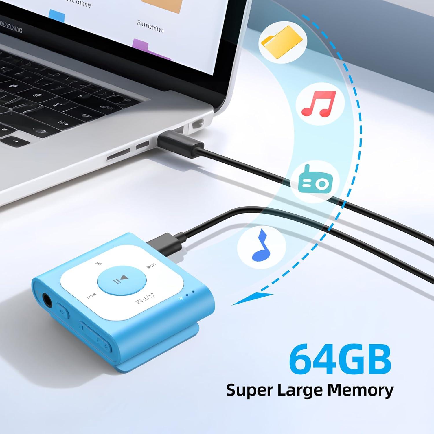 AGPTEK 64GB Clip MP3 Player with Bluetooth, A53PL Portable Music Player with FM Radio, Shuffle, No Phone Needed, for Sports (Blue)(Blue)
