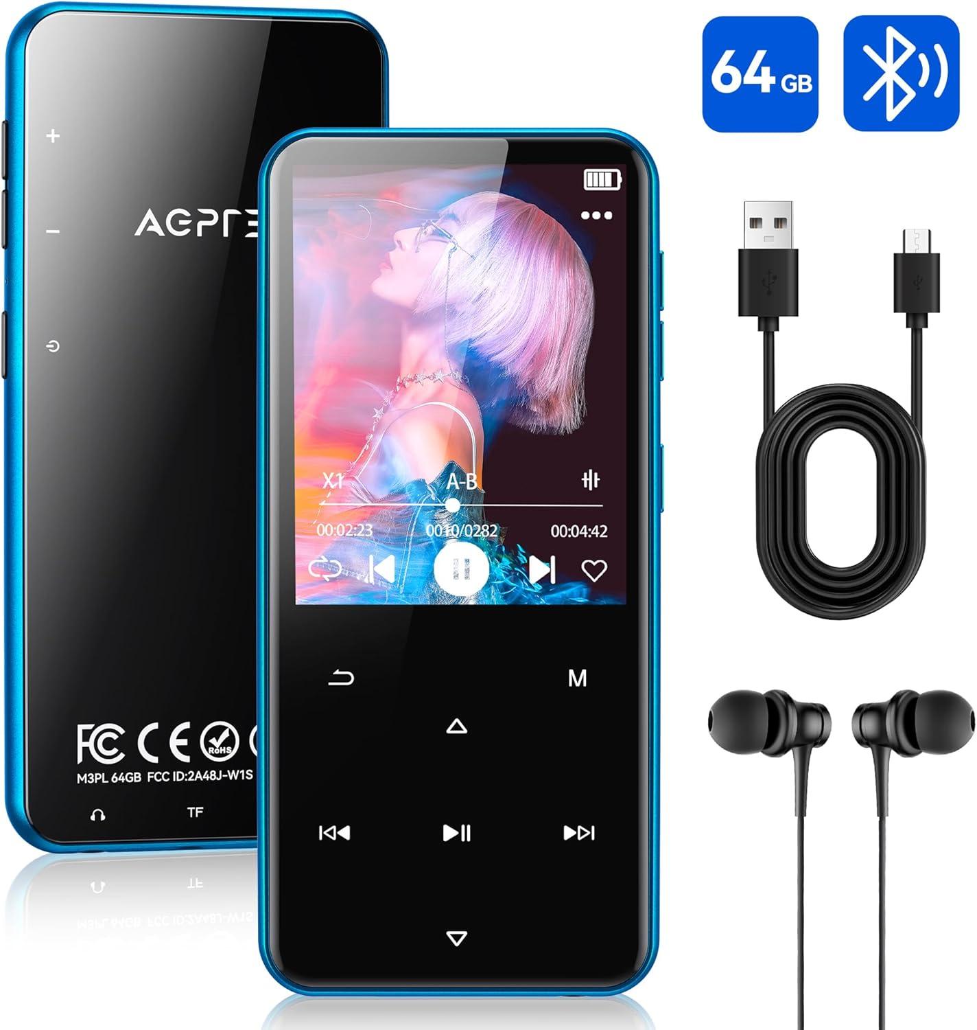 AGPTEK 64GB MP3 Player with Bluetooth, M3 2.4 inch Music Player with Speaker and FM Radio, Touch Buttons, Supports Up to 128GB(Blue)(Green)