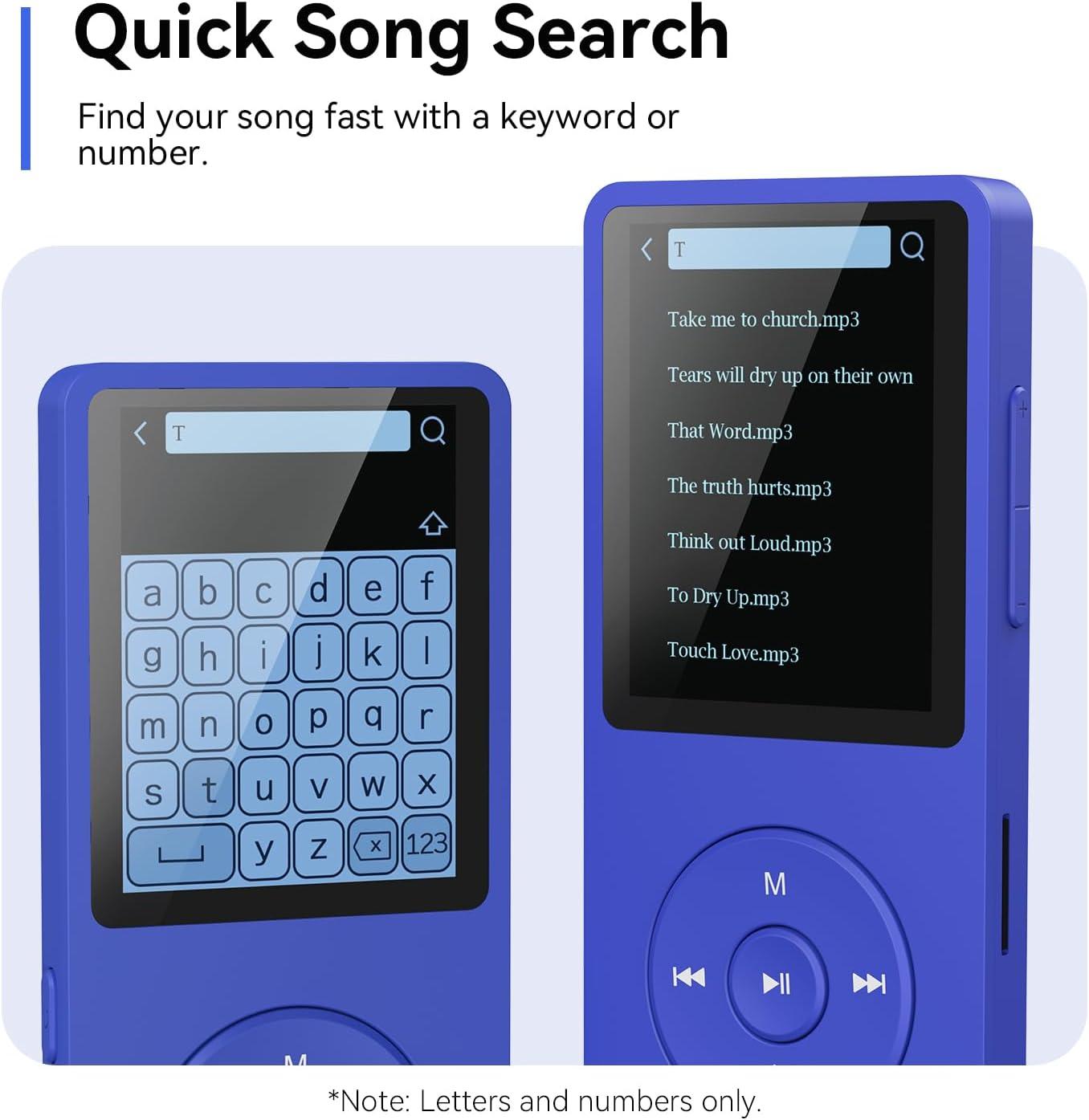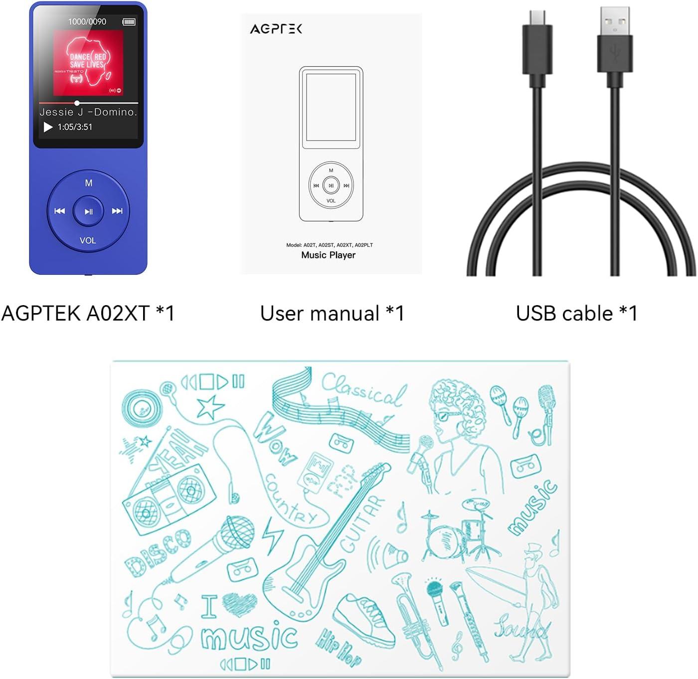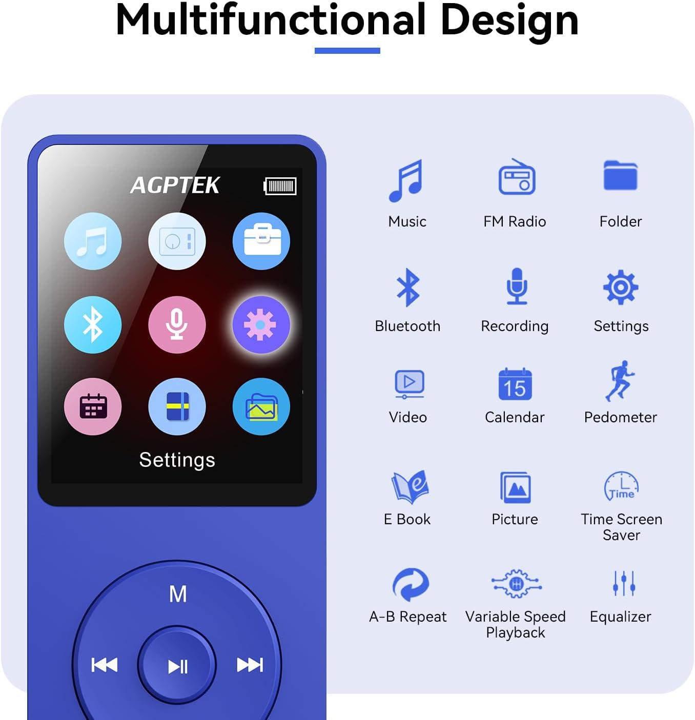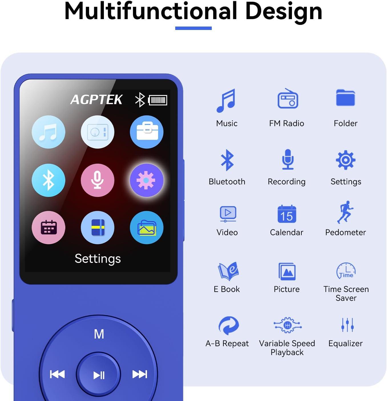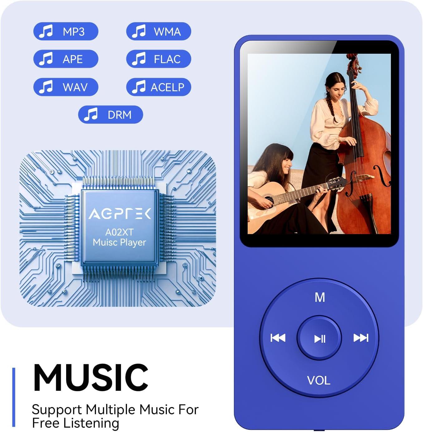 AGPTEK A02 MP3 Player with Bluetooth 5.3, 1.8 inch Screen Portable Music Player with Speaker, FM Radio, Voice Recorder, Supports Expanded Up to 128GB(Black, 32GB)(Blue)