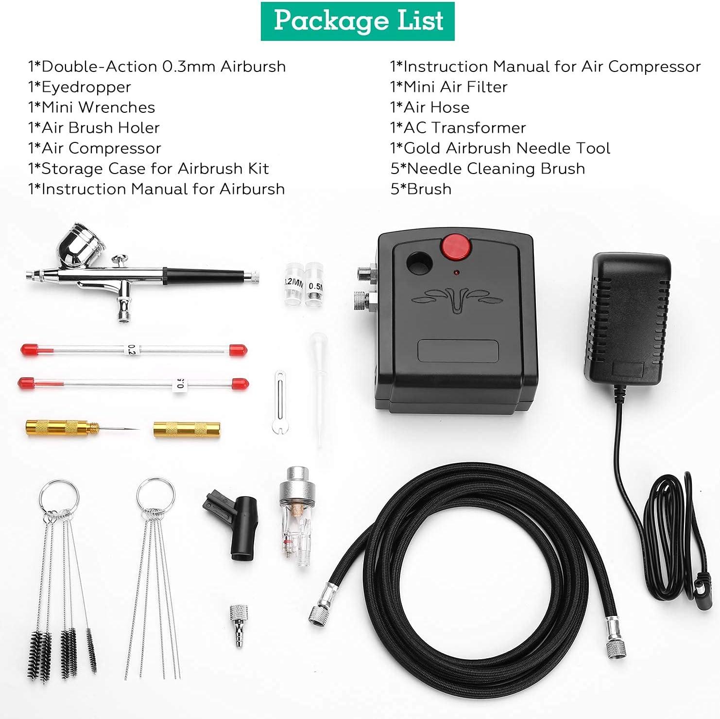 ◆ MULT-PURPOSE AIRBRUSH SET: This airbrush set comes with three different kinds of nozzles, covering needles, fluid tips and air caps (of which, the size of needles respectively is 0.2, 0.3 and 0.5mm) It weighs 1/3 ounce and it proves to be a gravity liquid cup. Besides, it also contains a 1/8“joint and a 6-inch mini air hose.