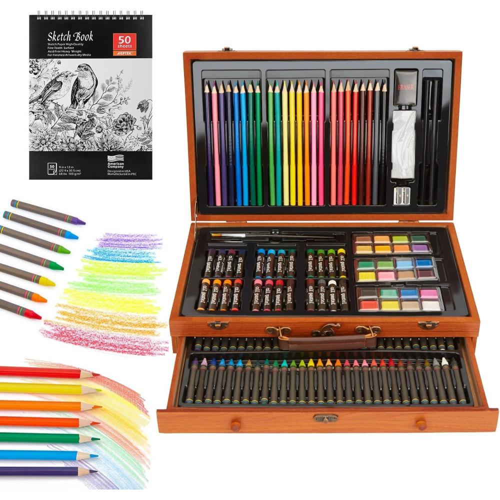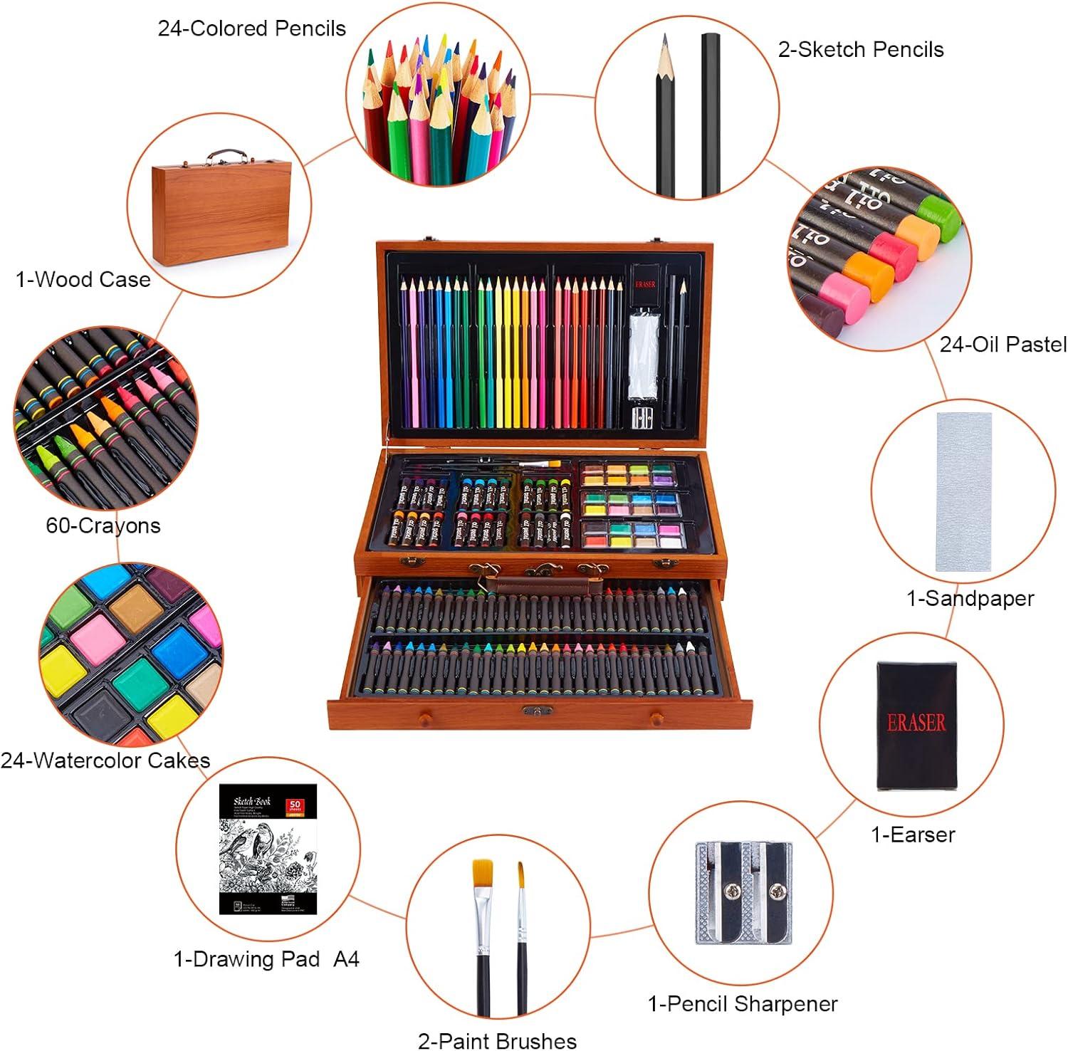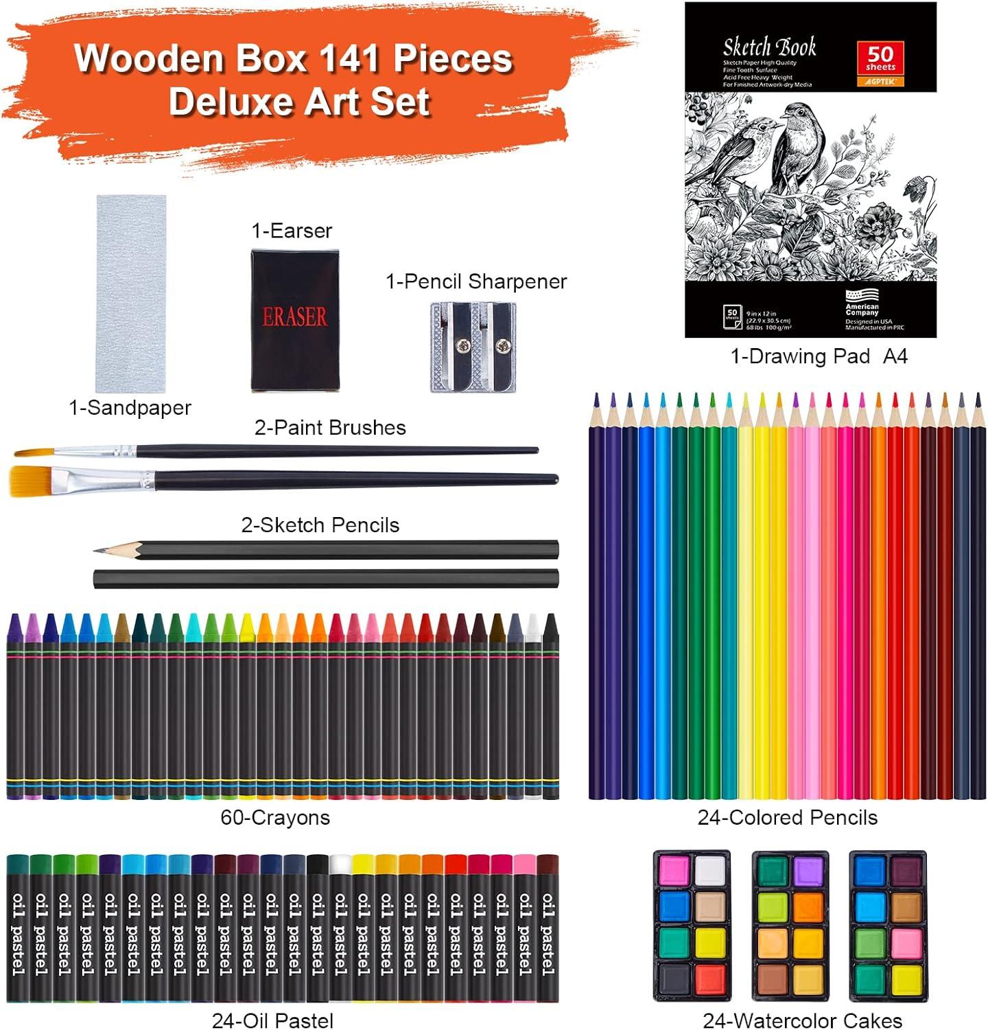 COMPLETE SET: The package covers almost everything that meets children’s drawing needs, including 60 crayons, 24 colored pencils, 2 sketch pencils, 24 watercolor cakes, 2 paint brushes, 1 metal pencil sharpener, 1 eraser, 1 sandpaper, 24 oil pastels, 1 wooden case with drawer and 1 drawing pad with 50 sheets (A4, 100gsm).