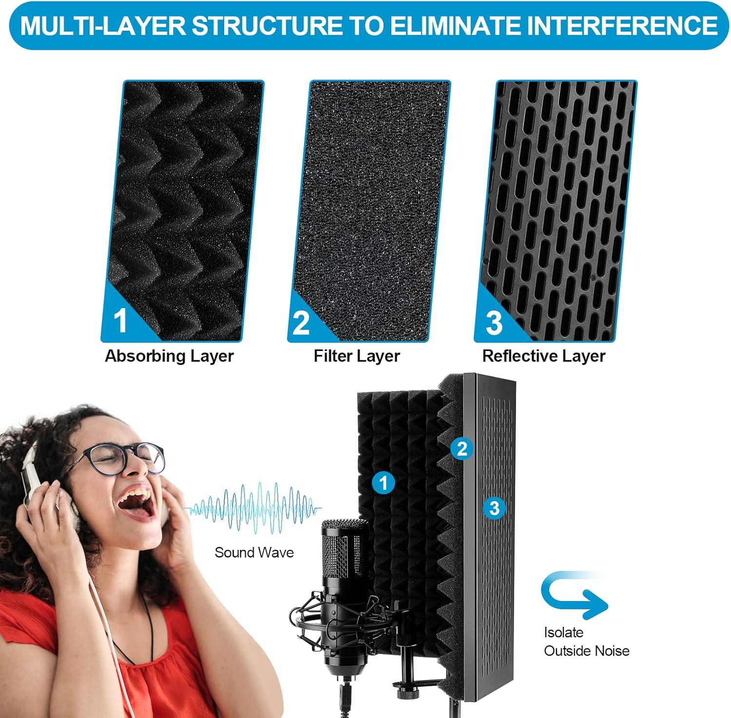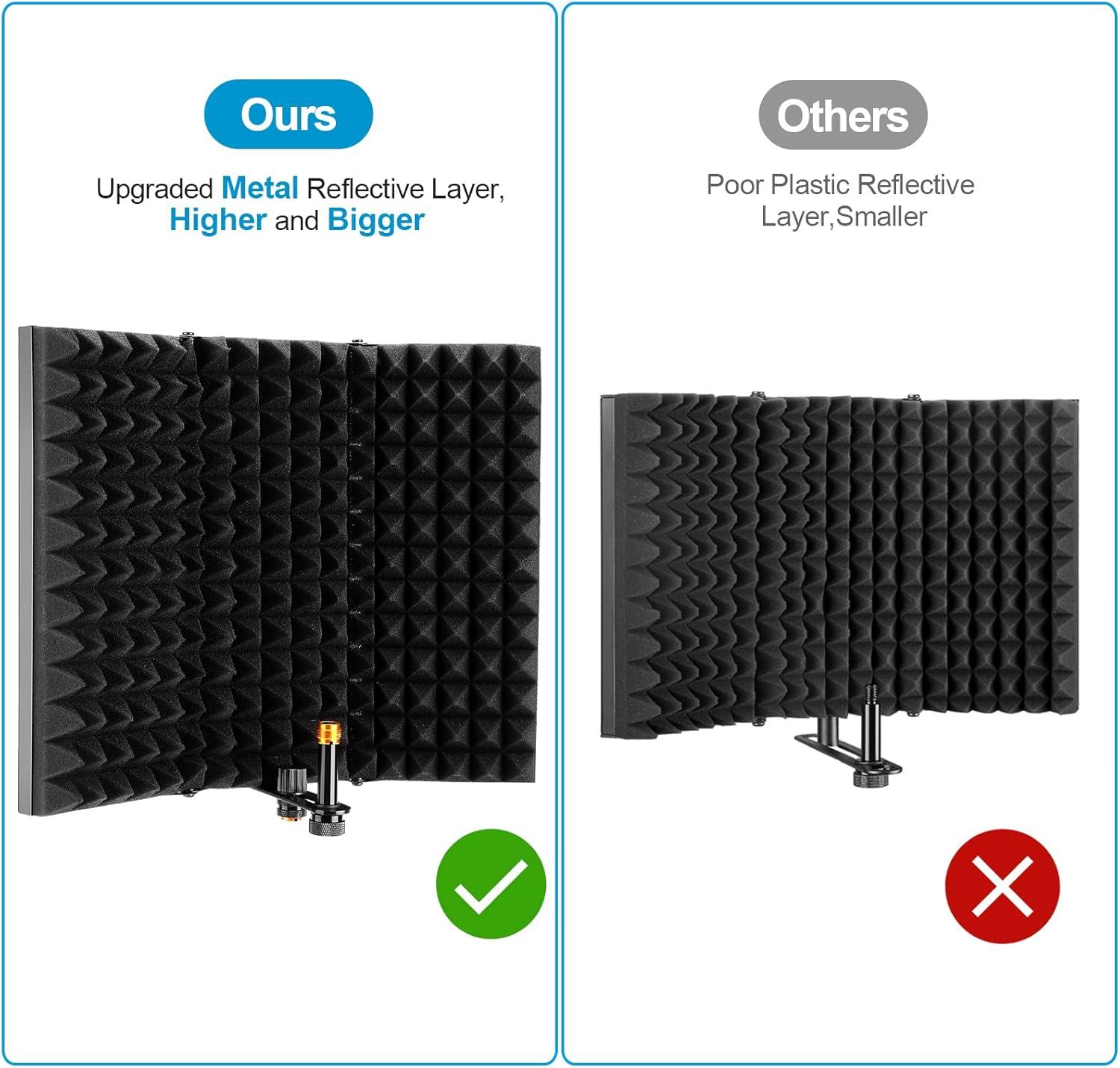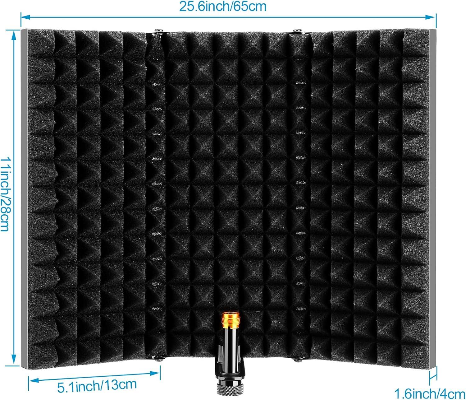 ♦ ADJUSTABLE, FOLDABLE & PORTABLE: This Mic shield that consists of three panels together has two folding panels and it’s free to adjust the angle and the angle reaches up to 145 °, so it is way convenient for you to take this sound shield with you wherever you go.