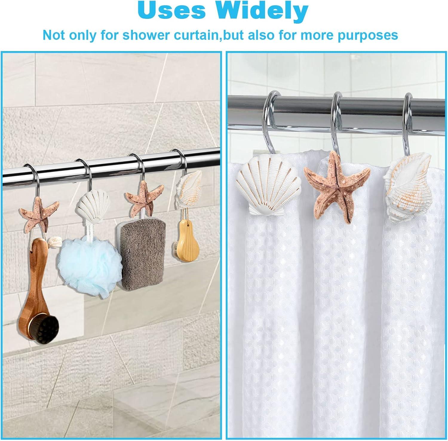 • Set of 12 PCS Shower Curtain Hooks — This package includes 12 pcs shower curtain hooks, Blue shells, Anti-rust alloy hook and Acrylic shells.