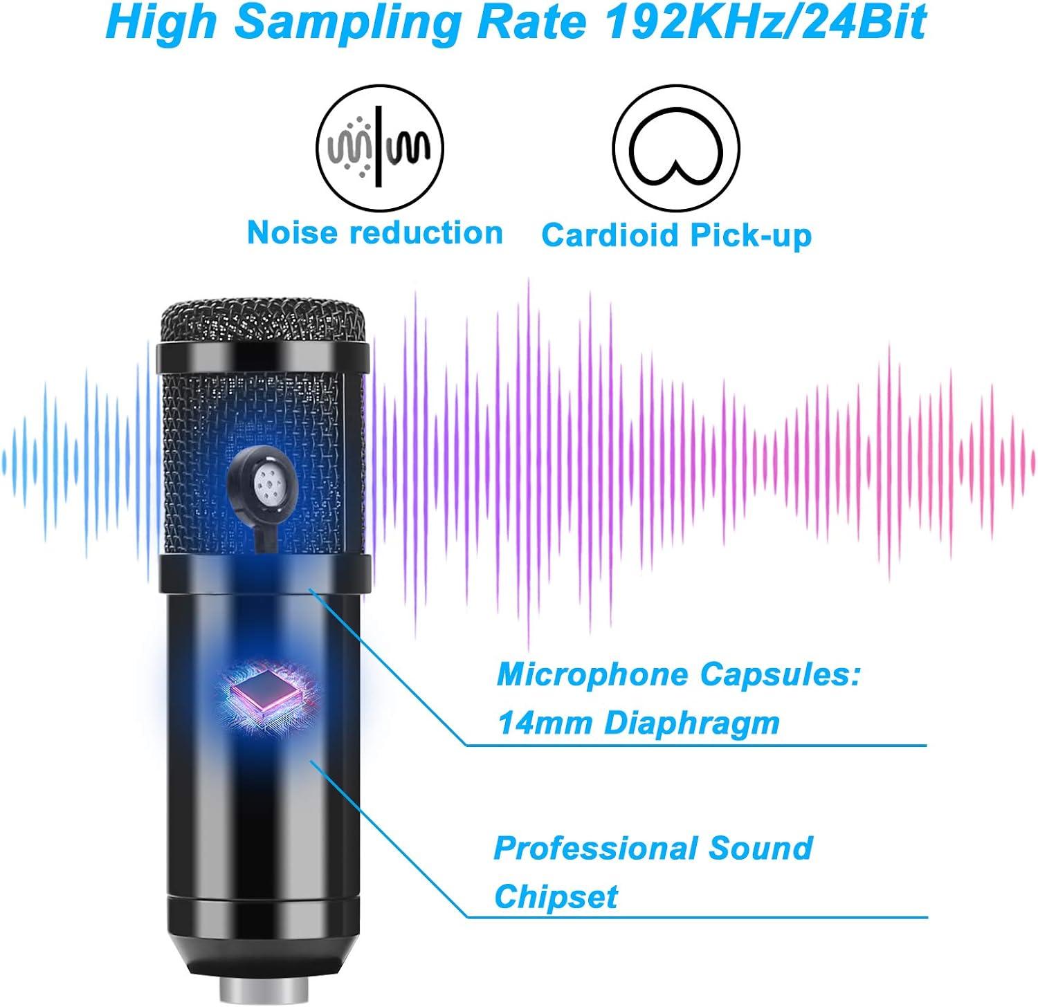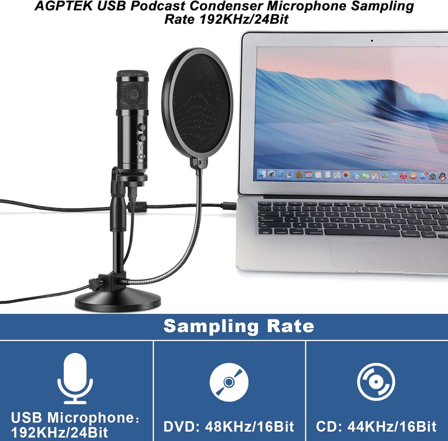 AGPTEK USB Microphone, USB Microphone Kit 192KHz/24Bit USB Condenser Podcast Streaming Microphone with Table Mic Stand, Pop Filter and Wind Foam for Skype, YouTube, Gaming, Karaoke and PC
