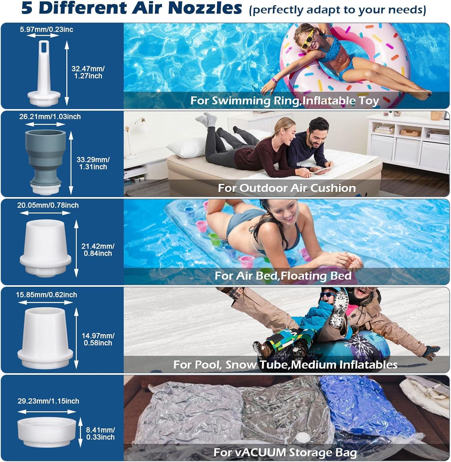 VERSATILE USE: Our mini air pump comes with 5 nozzles, so it is applicable to most small and large inflatable products, such as air cushions, inflatable beds, pool floats, sleeping pads, swimming rings, inflatable furniture, pool inflatables, and more. It is made up of sturdy ABS material and features high sealing technology to ensure durability and effective sealing. (NOTE: This air pump is NOT FOR BALLOONS!!!!!!)