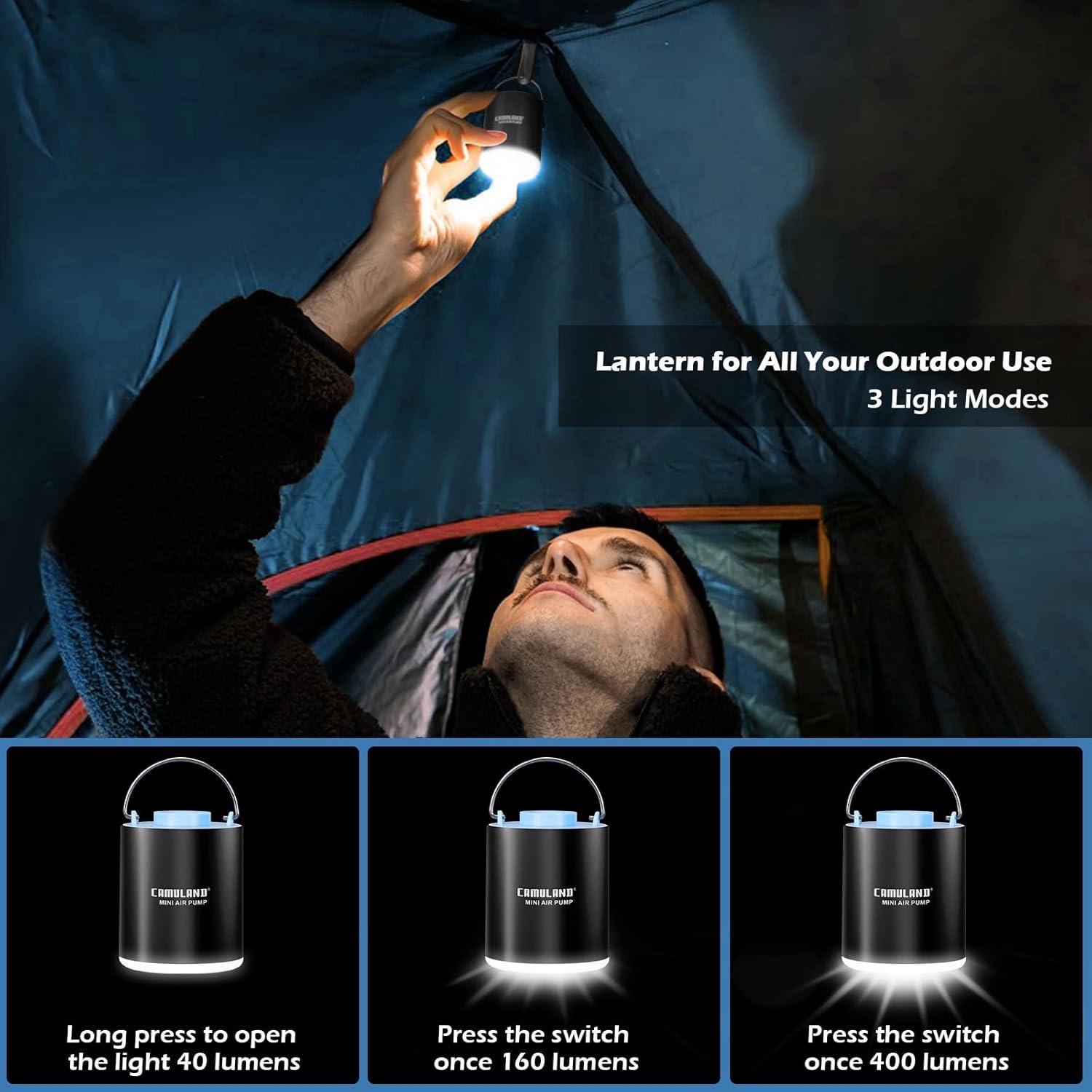 CAMPING LAMP: The bottom of the camping lamp is composed of 8 integrated LED beads with 3 different brightness adjustment functions, thereby providing a wide range of illumination and high brightness. There are three levels of brightness adjustment(400, 160 and 40 lumens) to meet different lighting needs. It is suitable for camping tents, night walks, power outage and other occasions. Converting the mini air pump into a portable LED lamp makes it an indispensable choice for outdoor camping.