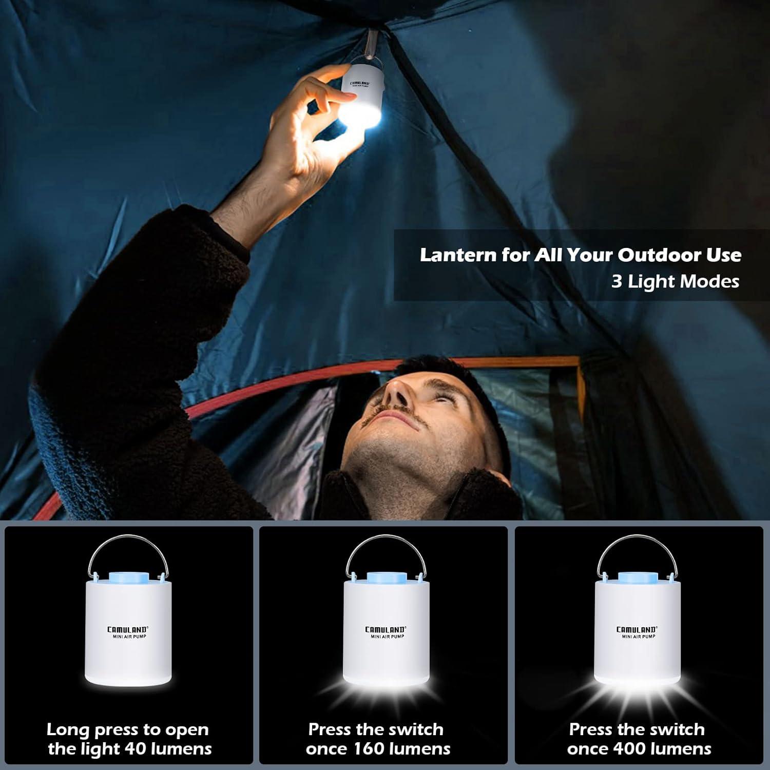 CAMPING LAMP: The bottom of the camping lamp is composed of 8 integrated LED beads with 3 different brightness adjustment functions, thereby providing a wide range of illumination and high brightness. There are three levels of brightness adjustment(400, 160 and 40 lumens) to meet different lighting needs. It is suitable for camping tents, night walks, power outage and other occasions. Converting the mini air pump into a portable LED lamp makes it an indispensable choice for outdoor camping.