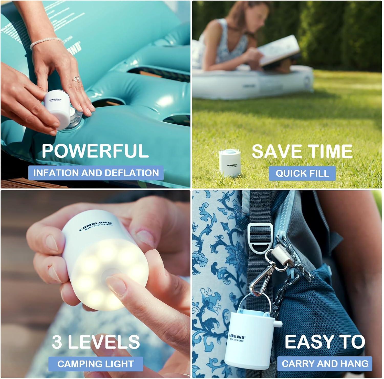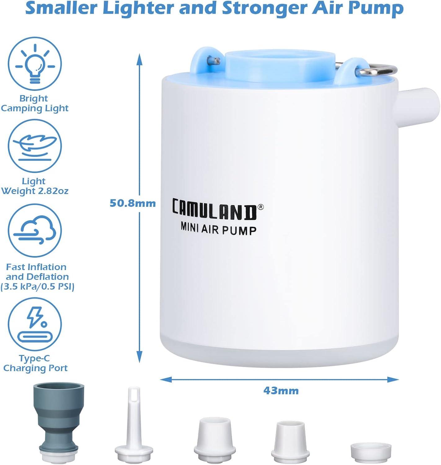 CAMULAND Mini Air Pump, Sleeping Pad Pump Portable Air Pump for Inflatable with 1300mAh Battery USB Rechargeable Camping Light 5 Nozzles for Air Mattress, Pool Floats,Vacuum Storage Bag(Blue)