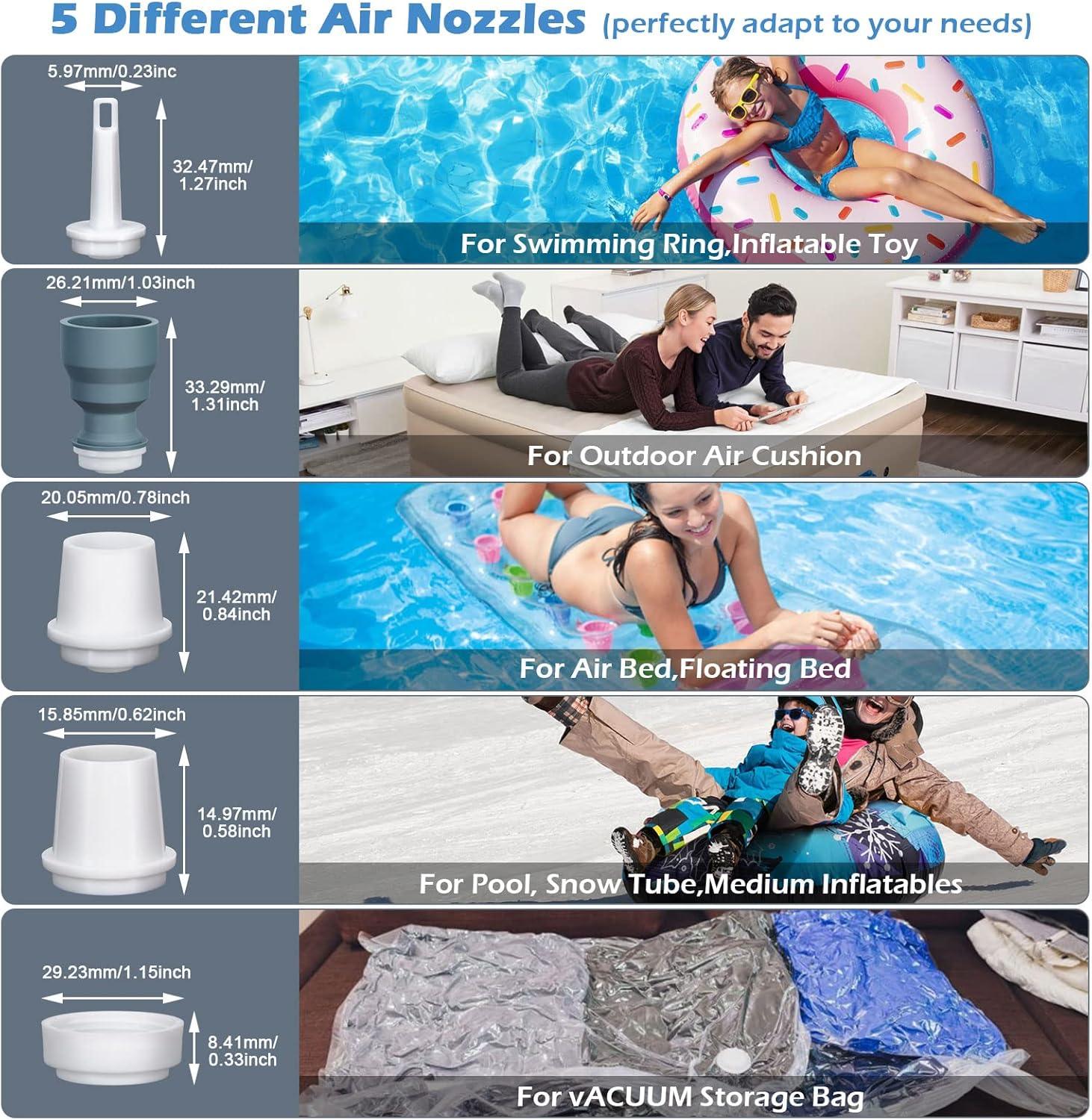 VERSATILE USE: Our mini air pump comes with 5 nozzles, so it is applicable to most small and large inflatable products, such as air cushions, inflatable beds, pool floats, sleeping pads, swimming rings, inflatable furniture, pool inflatables, and more. It is made up of sturdy ABS material and features high sealing technology to ensure durability and effective sealing. (NOTE: This air pump is NOT FOR BALLOONS!!!!!!)