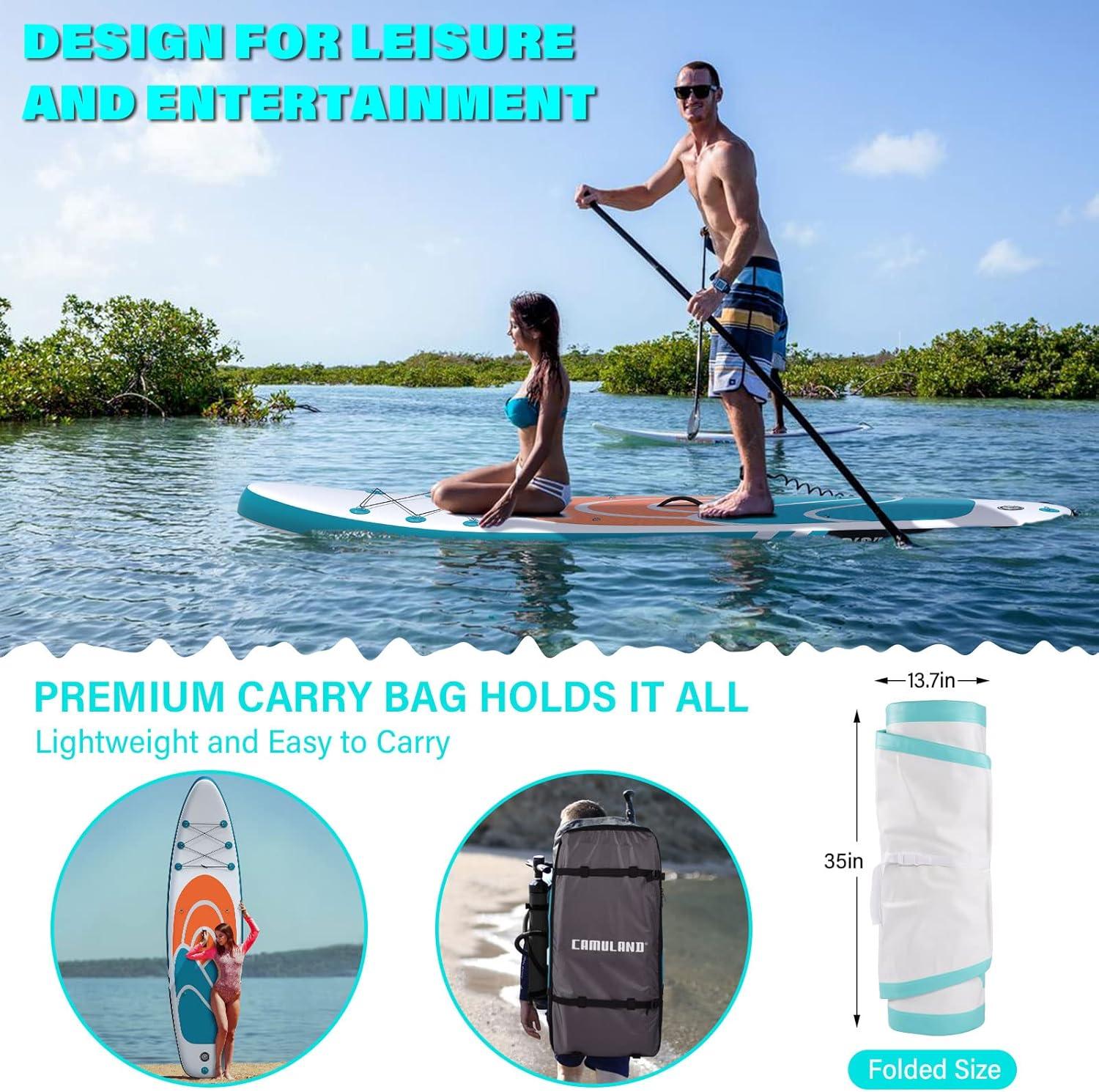 🚣DURABLE IN USE: This lightweight and portable paddle board is formed by army grade PVC material, which turns out to be tough, sturdy, solid and durable. Therefore, it is not easy to get punctured. More vitally, the anti-slip EVA deck pad significantly enhances the stability and safety when you are standing on the paddle board. The foam is soft and comfortable. You can stand up, lie down or kneel down on the board to paddle for quite a long time.