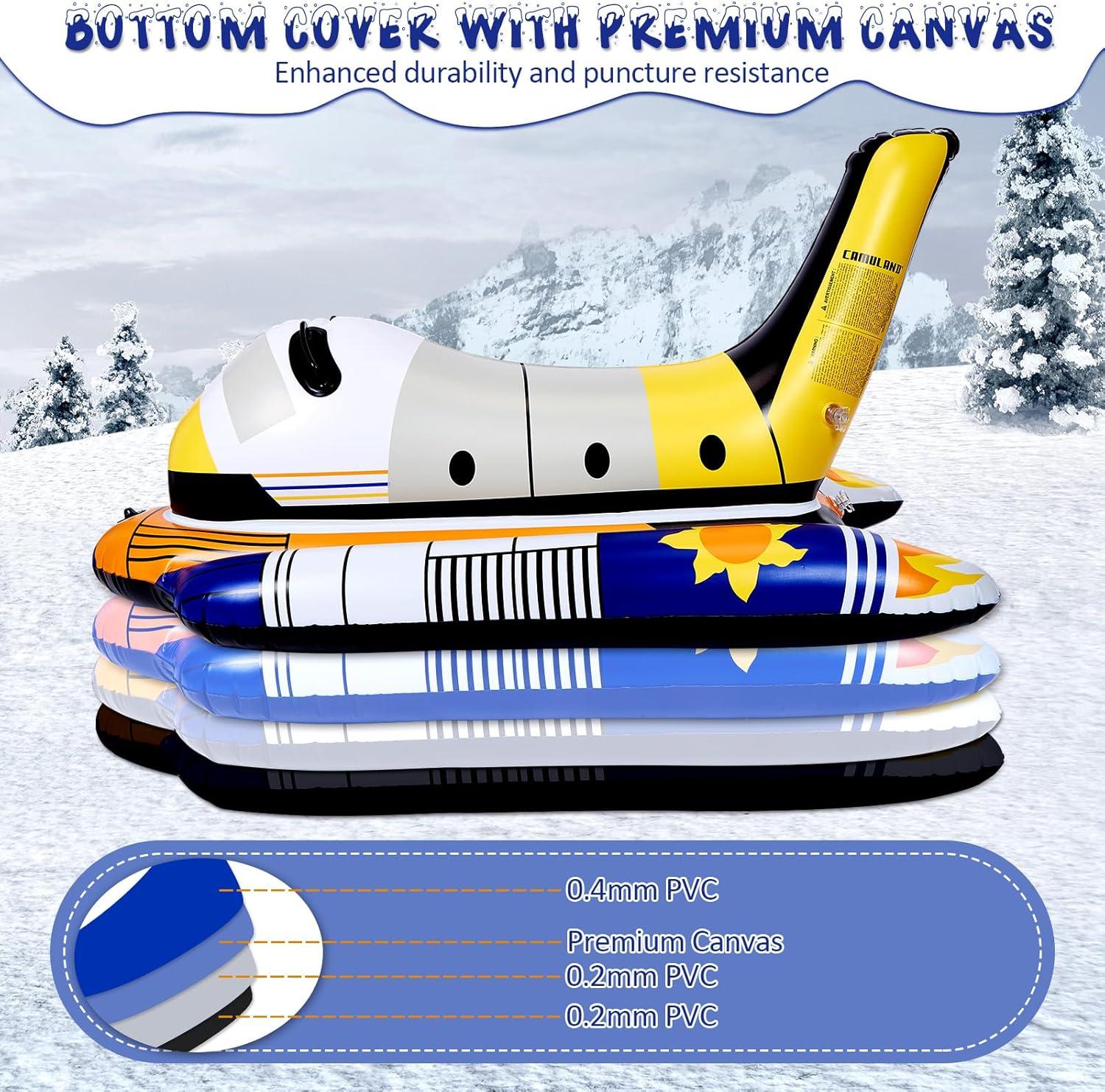 Durable and Safe: Our CAMULAND Snow Tube is made from high-quality tear-resistant PVC material, ensuring durability and safety. It can withstand extremely low temperatures and impacts. With a 0.8mm thick bottom consisting of four layers, including a 0.4mm PVC layer, premium canvas layer, and two 0.2mm PVC layers, it is more durable compared to standard 0.45mm sleds. Experience fast and exhilarating sledding on the smooth bottom.