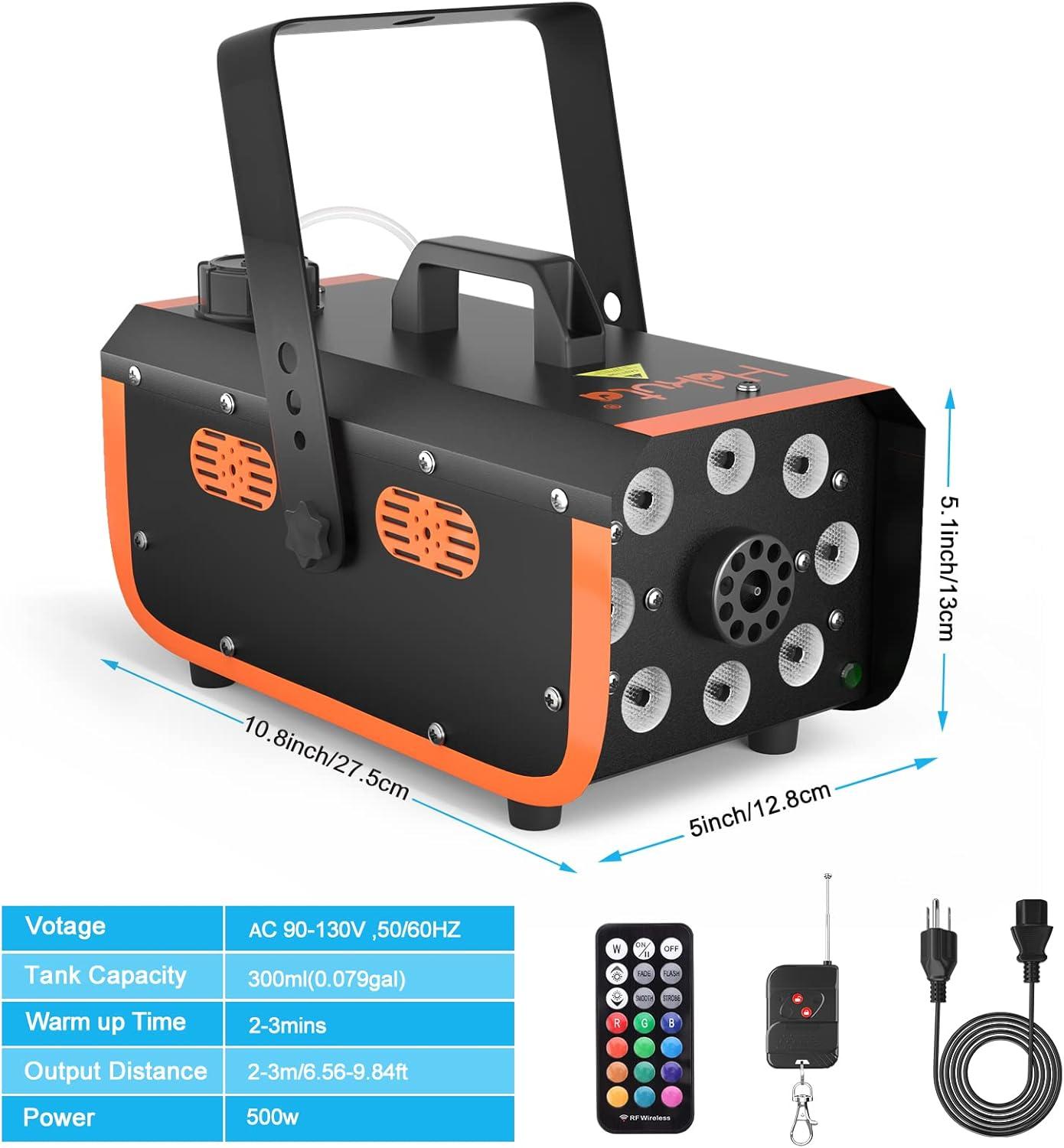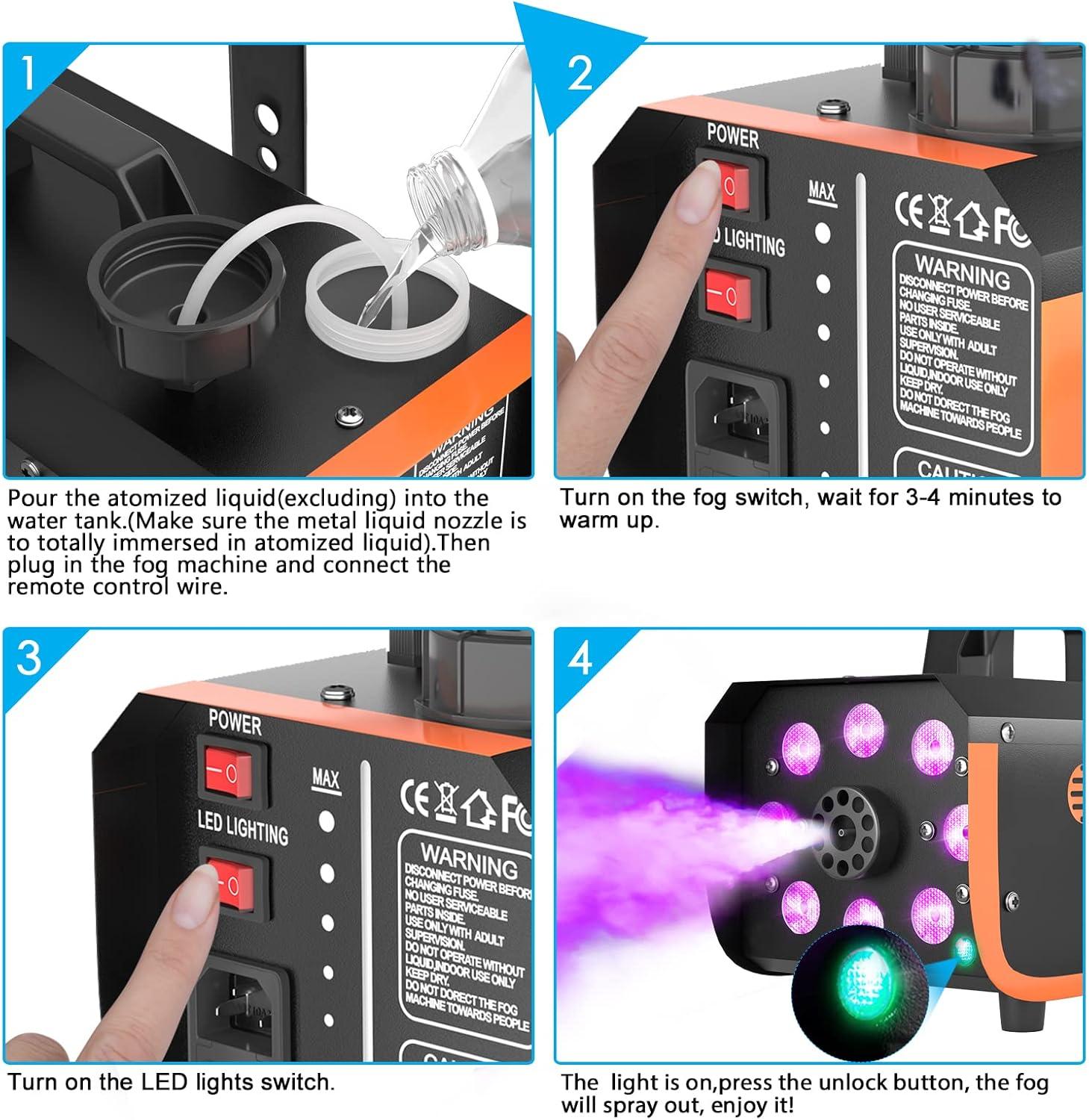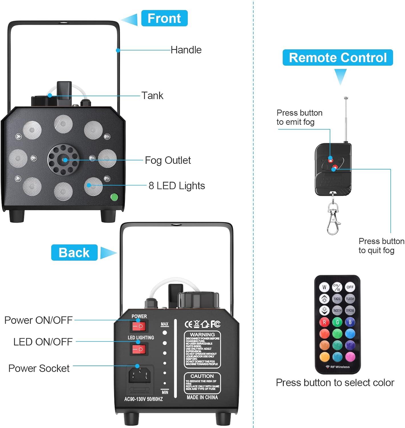 EASY TO CONTROL: Our upgraded smoke machine is equipped with 2 wireless remotes. One is used on the fog machine per se and the other is used to control the color of LED lights. In this way, you’ll find it more convenient to use it to select the color of lights and change the color mode.NOTE: FOG LIQUID NOT INCLUDED!!