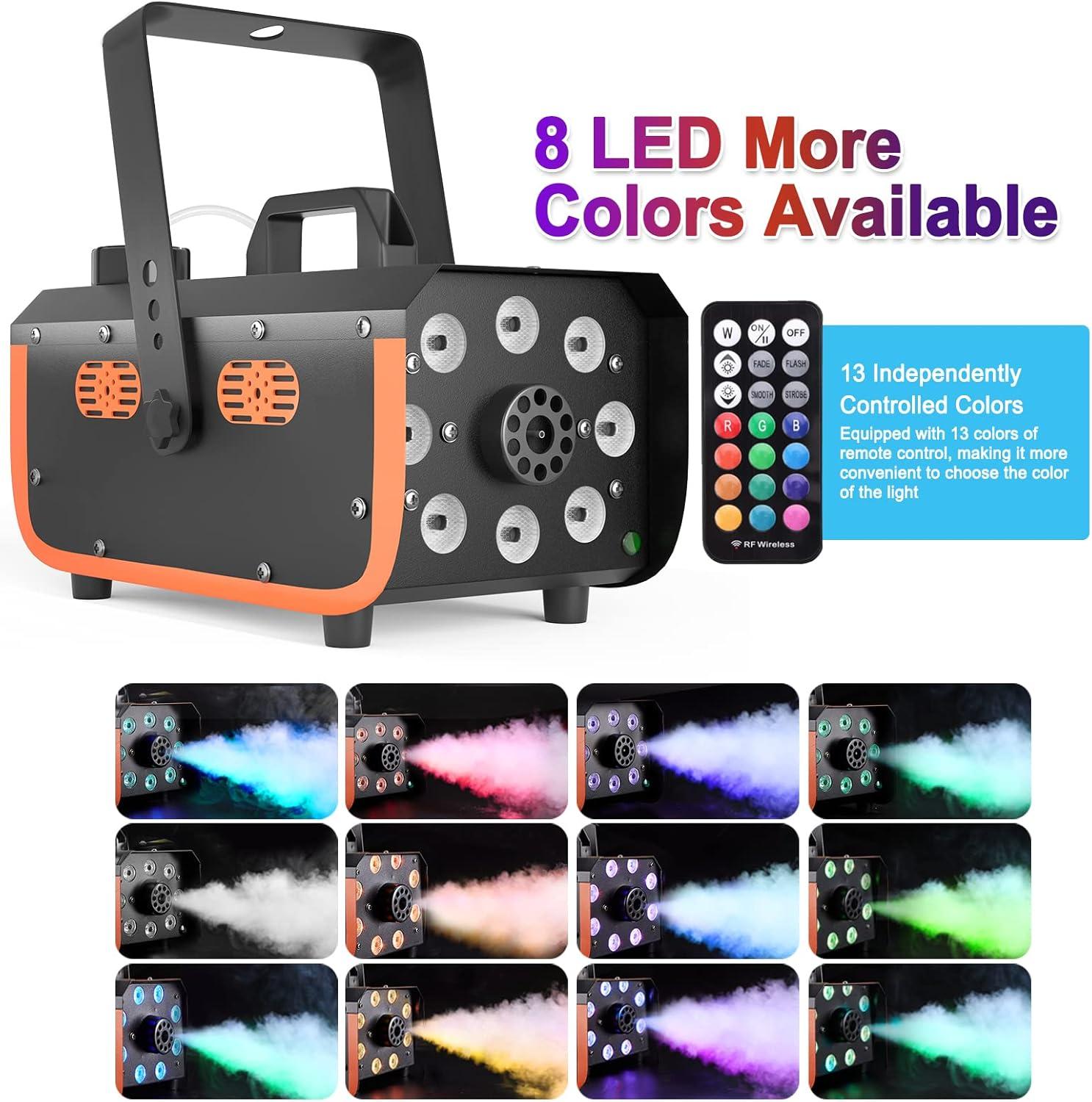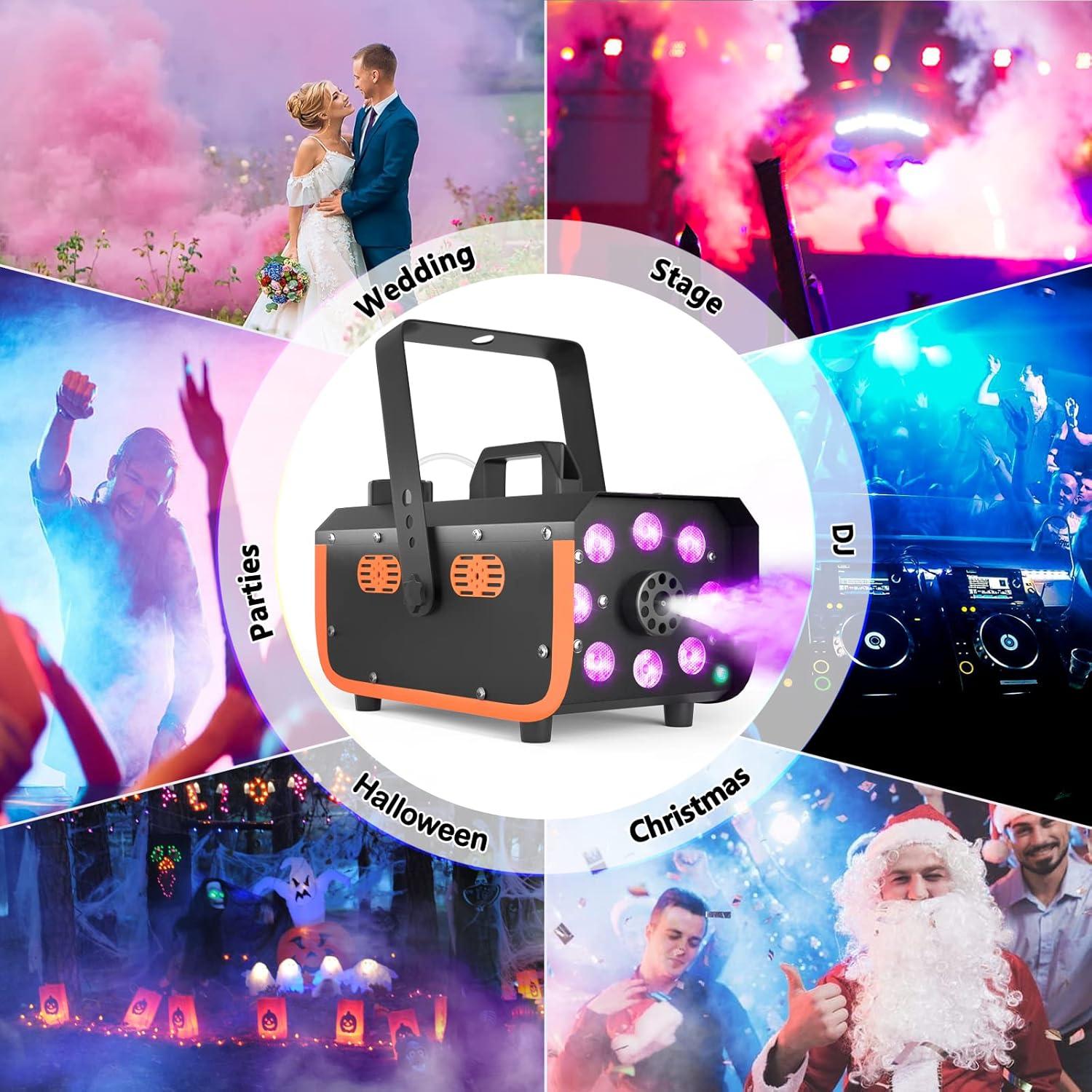 UPGRADED COLOR EFFECTS: There are 13 colors for you to choose from, i.e. red, blue, green or mixture(cyan, rose red, yellow and white). All kinds of lighting effects can be shown at different speeds(fade, flash, smooth and strobe). Besides, you can use the fog machine without worrying any health issues because it doesn’t generate any noxious gas.